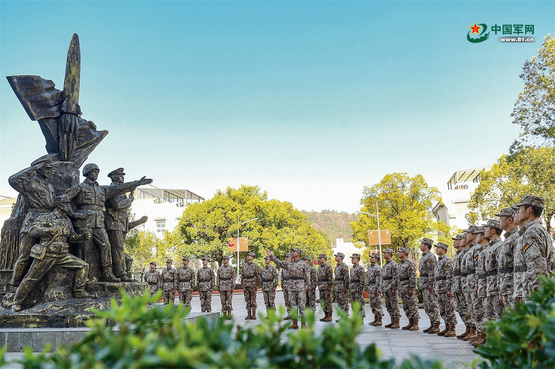 某发射分队官兵在军史长廊“聚人成山”主题雕像区,开展优良传统教育。钱凯祥 摄