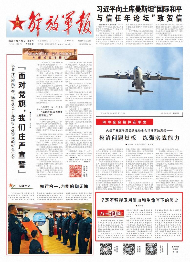 “历史就是历史,事实就是事实,任何人都不可能改变历史和事实。付出了巨大牺牲的中国人民,将坚定不移捍卫用鲜血和生命写下的历史。”今年是中国人民抗日战争暨世界反法西斯战争胜利80周年,也是台湾光复80周年。作为新时代革命军人,我们必须保持高度戒备状态,全面提高备战打仗能力,时刻准备为正义而战、为和平而战、为人民而战,坚决维护国家主权、安全、发展利益。