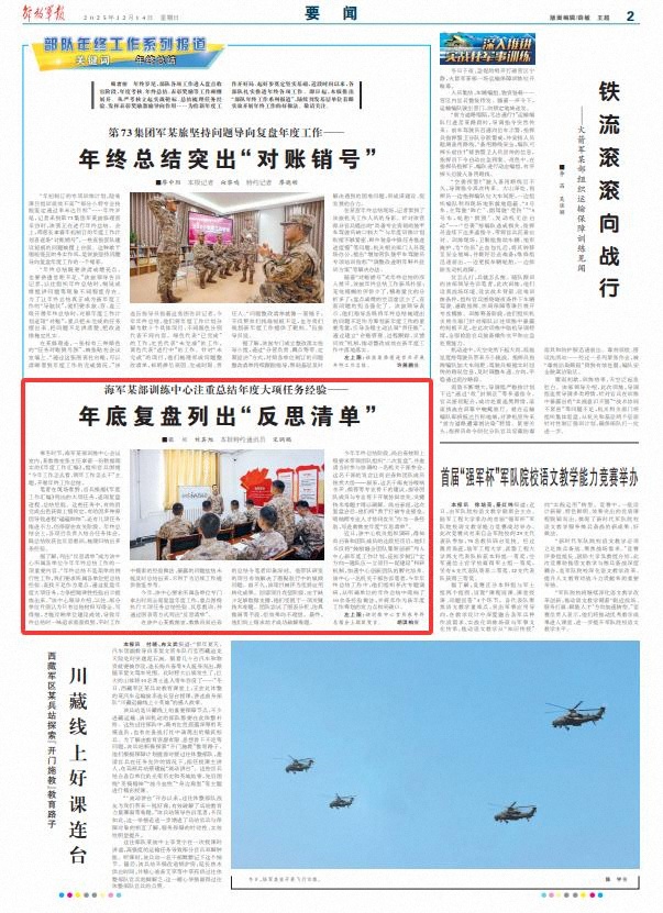 笔者在现场看到,官兵根据《年度工作汇编》列出的大项任务,逐项复盘进程、总结经验。这些任务中,有的因完成出色获得上级肯定,有的因多种原因导致进程“磕磕绊绊”,还有几项任务推进不力,仍停留在攻关阶段。年终总结会上,各项目负责人结合任务体会,既总结收获也反思教训,梳理归纳出多条经验。