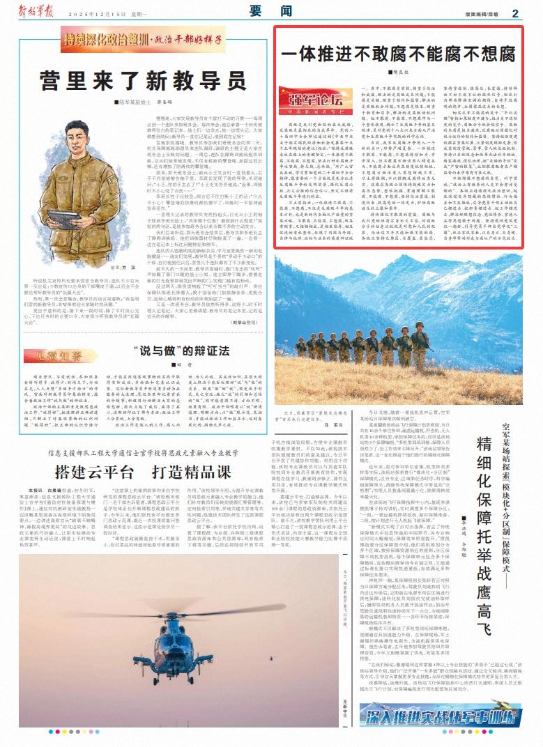腐败是我们党面临的最大威胁,反腐败是最彻底的自我革命。党的二十届四中全会审议通过的《中共中央关于制定国民经济和社会发展第十五个五年规划的建议》指出:“保持反腐败永远在路上的清醒坚定,一体推进不敢腐、不能腐、不想腐,坚决打好反腐败斗争攻坚战、持久战、总体战。”对广大官兵来说,学习贯彻党的二十届四中全会精神,很重要的一个方面就是充分认清反腐败斗争的光明前景,强化反腐必胜、正义必胜的信念信心,坚定不移将反腐败斗争进行到底。