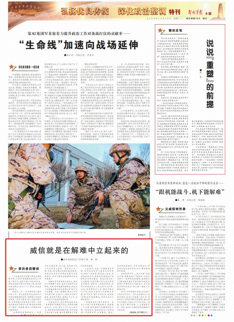 “问题在基层,根子在机关。政治工作能不能发挥威信威力,很重要一个方面,就是看能不能解决难点问题。”回到机关,我组织政治工作部全体人员检视反思、对照整改。随后,我向部党委建议,召开专题会议,研究如何及时回应官兵关切,解决基层现实难题。