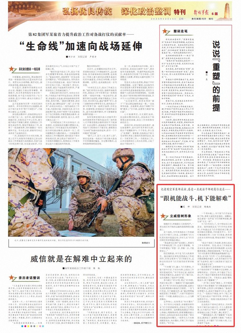 一次“政工夜校”课堂上,韦宁围绕《政治干部应掌握的飞行训练基础内容》展开授课,让很多人深受触动。“备战打仗需要什么,政治干部就学习什么、提升什么。”一名政治干部说,如今,“政工夜校”已成为政治干部学军事、学科技、学指挥的平台,一批能文能武的政治干部正在加速成长。