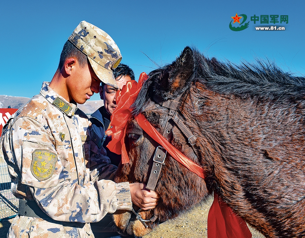 千里之外,第76集团军某旅玉树独立骑兵连军马退役仪式结束后,军马勤务班中士李畅畅久久不愿离去,向退役军马“虎威”告别。