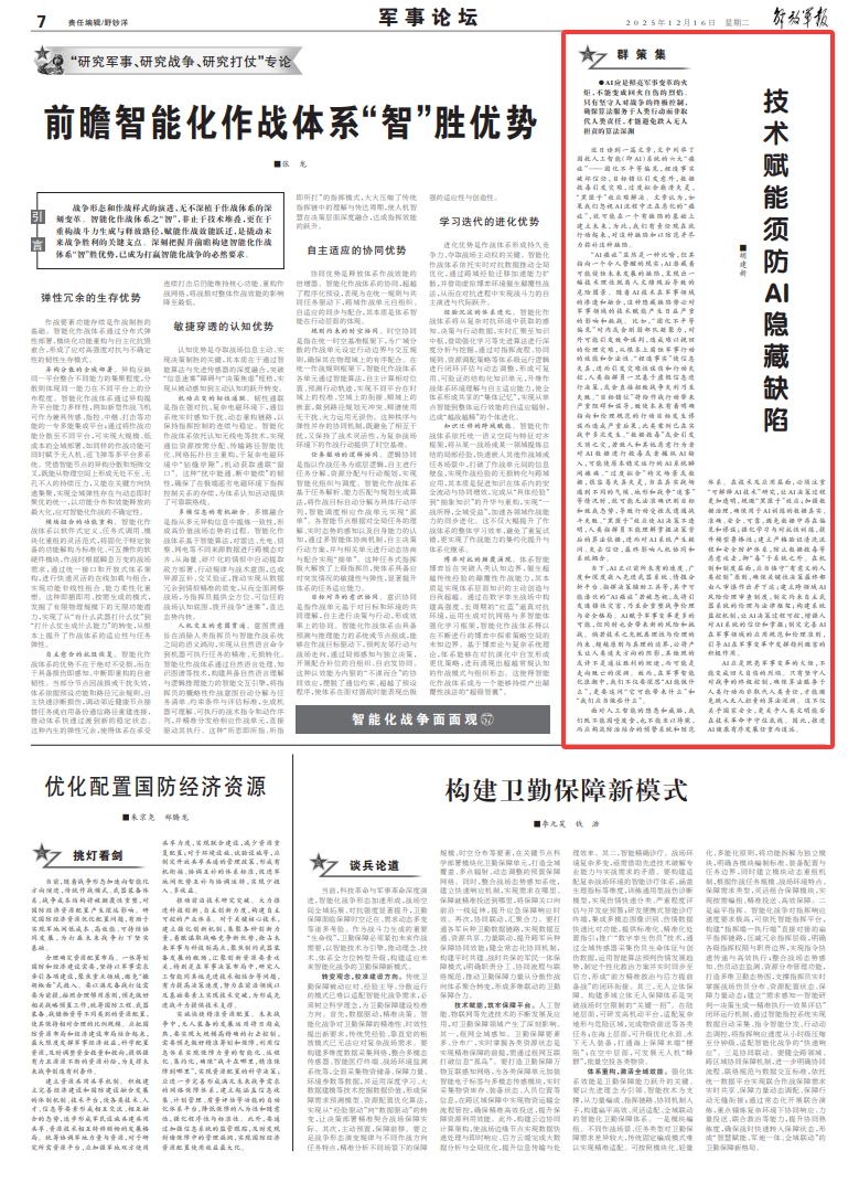 当下,AI正以前所未有的速度、广度和深度嵌入先进武器系统、情报分析平台、指挥决策辅助工具等,其中可能潜伏的“AI癌症”若被忽视,或将引发连锁性灾害,乃至会重塑战争伦理与安全格局。AI赋予军事变革更多的可能,但同时也会带来新的风险和挑战。倘若技术之光脱离理性与伦理的约束、超越原则与真理的边界,必将产生让人类迷失方向的阴影,其烛照的或许不是通往胜利的坦途,而可能是走向败亡的深渊。故而,在军事智能化浪潮中,我们不仅要深思“AI能做什么”,更要追问“它可能带来什么”和“我们应当做些什么”。