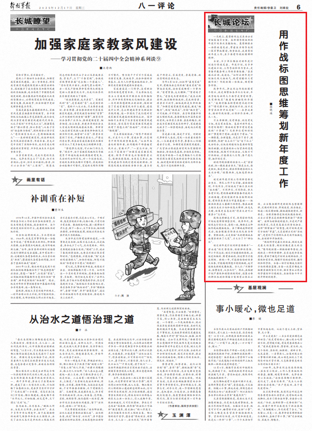 “规划科学是最大的效益,规划失误是最大的浪费,规划折腾是最大的忌讳。”像作战标图一样搞好新年筹划,体现的是一种科学精神、求实态度和系统思维,有助于避免计划的主观倾向性、片面性和盲目性,增强计划的延续性、操作性和科学性。当每一份计划都成为指引方向的精准蓝图,当每一次落实都成为按图索骥的坚定行动,强军事业必将在科学谋划中行稳致远,在接续奋斗中不断开辟新的境界。