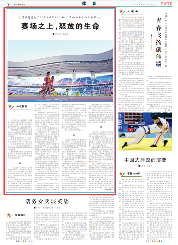 田径赛场上,运动员们不断上演超世界纪录的精彩表现,让现场观众大呼过瘾。12月11日,江苏队选手邹莉娟在女子铁饼F34级决赛中,以23米29超世界纪录的成绩收获金牌。前一天,她在女子标枪F34级决赛中以22米73的成绩夺冠,超过了她去年在巴黎残奥会上创下的世界纪录。