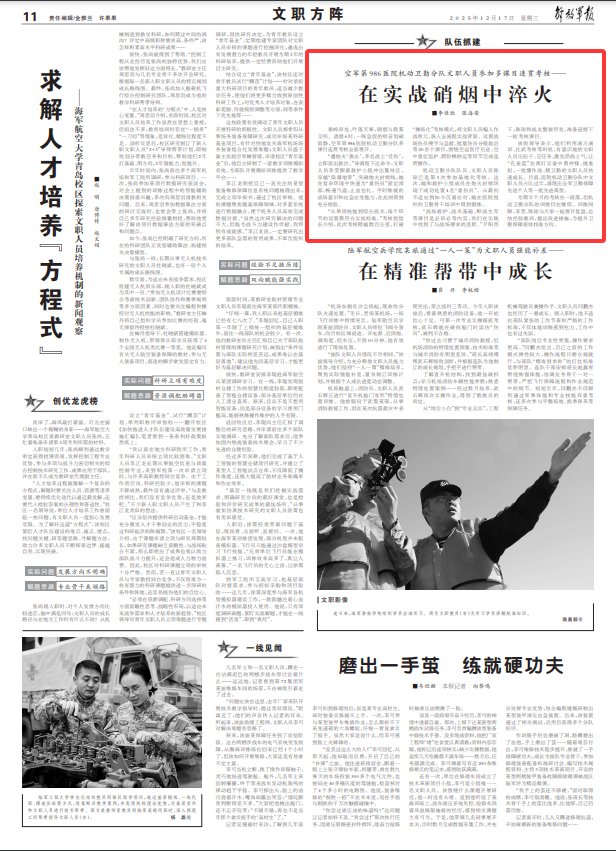 该院领导表示,他们利用演习演训、比武考核等时机,有意识地给文职人员压担子、交任务,激发昂扬士气,让“孔雀蓝”在真打实备中勇冲锋、挑重担,一批懂作战、精卫勤的文职人员快速成长。目前,医院机动卫勤分队中文职人员占比过半,涌现出全军卫勤保障先进个人等一批先进典型。