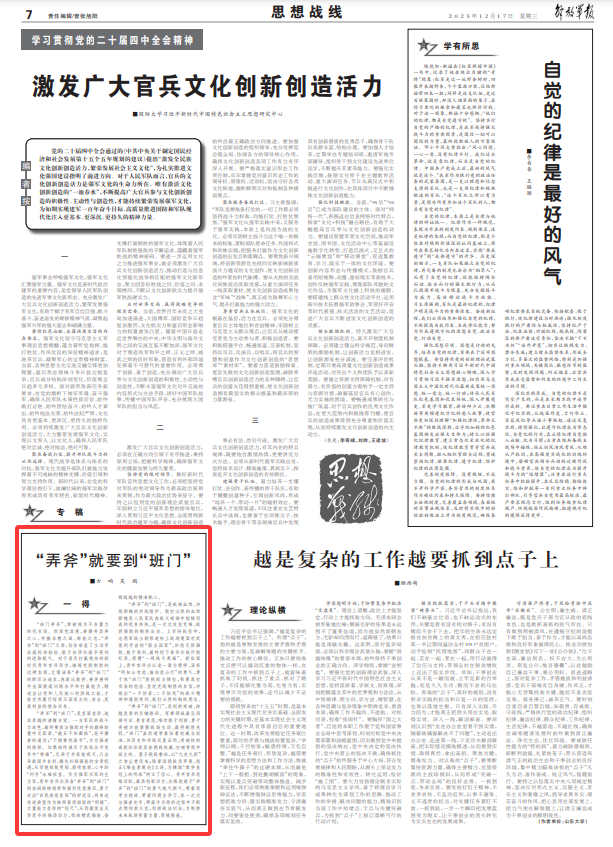“弄斧”到“班门”,是砥砺血性、淬炼胆魄的实践熔炉。敢打必胜的血性胆魄是人民军队在战火硝烟中熔铸而成的优良传统,是一次次攻坚克难、战胜强敌的制胜法宝。上甘岭战役中,志愿军战士胡修道初上战场便面对武装到牙齿的“联合国军”,但他无惧强敌、敢于亮剑,最终创下单兵作战歼敌纪录,荣膺“一级战斗英雄”。新征程上,青年官兵应以老一辈为榜样,涵养“明知山有虎,偏向虎山行”的勇气,勇于在“班门”前挑战与摔打,积累真打实备的经验、坚定克敌制胜的自信,淬炼出“一不怕苦、二不怕死”的战斗精神和逢敌亮剑、敢打必胜的钢铁意志。
