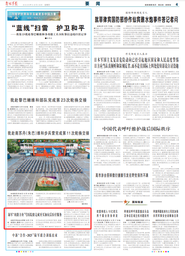 解放军报牙买加法尔茅斯12月17日电 崔晓洋、唐磊报道:当地时间16日,执行“和谐使命-2025”任务的中国海军“丝路方舟”号医院船圆满结束在牙买加的友好访问和医疗服务,驶离牙买加法尔茅斯港,前往巴巴多斯执行后续任务。