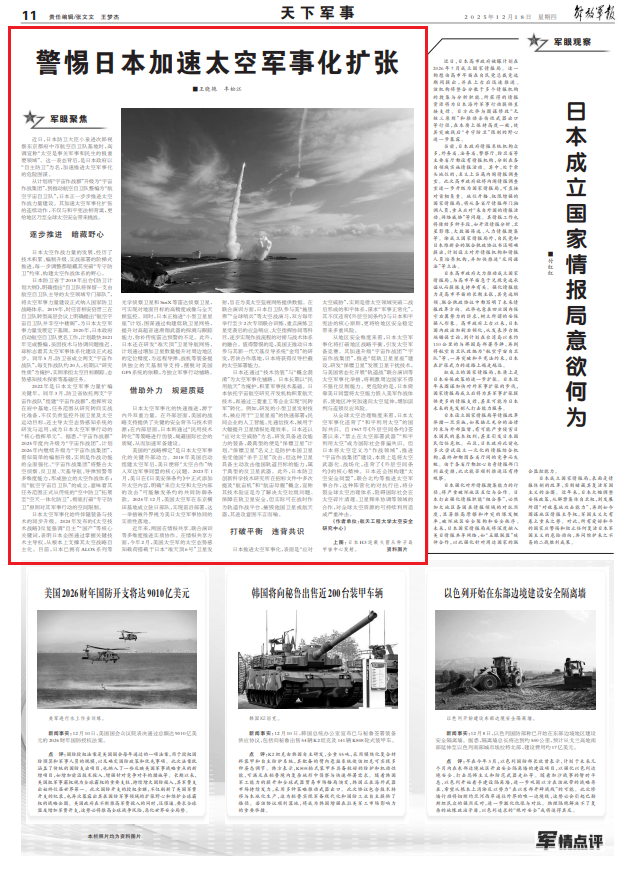 从计划将“宇宙作战群”升级为“宇宙作战集团”,到推动航空自卫队整编为“航空宇宙自卫队”,日本正一步步推进太空作战力量建设。其加速太空军事化扩张的连续动作,不仅与和平宪法相背离,更给地区乃至全球太空安全带来挑战。