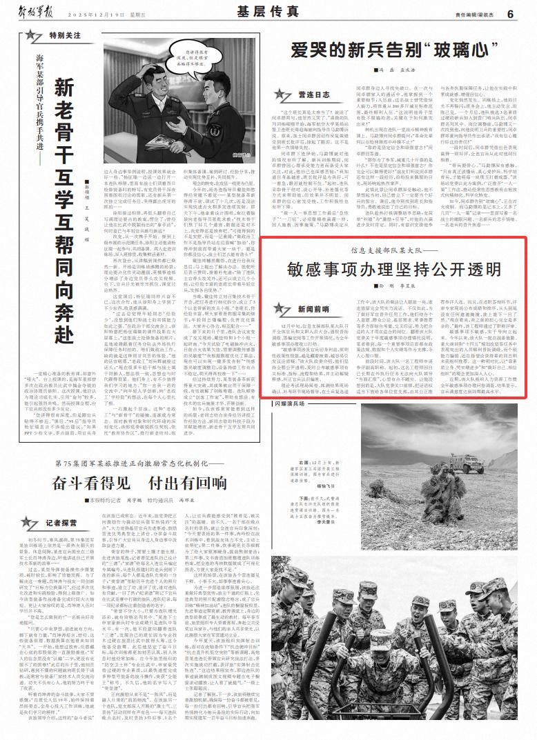 “敏感事项涉及官兵切身利益,原则性政策性很强,越是藏着掖着,越容易引发议论质疑。”该大队政委介绍,他们坚持全程公开透明,及时公布敏感事项有关标准、指标、流程和结果,并主动解疑释惑,纠正官兵认识偏差。