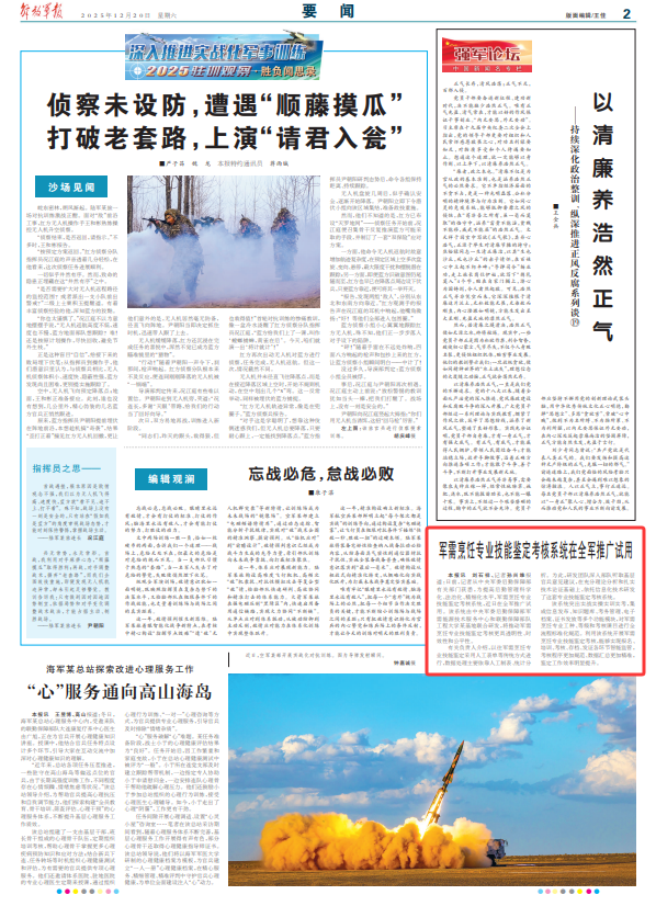 解放军报讯 刘石祥、记者孙兴维报道:日前,记者从中央军委后勤保障部有关部门获悉,为提高后勤管理科学化、法治化、精细化水平,军需烹饪专业技能鉴定考核系统,近日在全军推广试用。该系统由中央军委后勤保障部军需能源技术服务中心和联勤保障部队工程大学某基地联合研发,将推动军需烹饪专业技能鉴定考核更具透明性、时效性和公平性。
