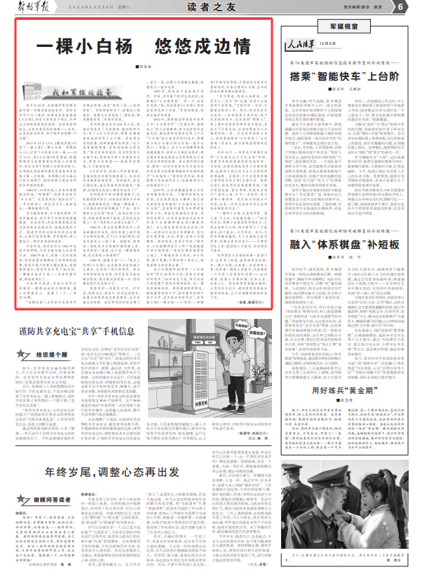 我希望把小白杨的故事一直讲下去,让更多人知道,在祖国西北边陲,有一棵小白杨,代表着一位母亲的心意,代表着一群战士的坚守,代表着每一个中国人对祖国的深情——这份深情,就像小白杨的根,扎在土里,长在心上。我也祝愿军报越办越好,让那些戍守边关、建功军营的青春壮歌得到颂扬,让小白杨精神继续传承下去。