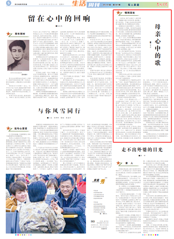 亲友们常常赞扬母亲“建设了好家庭、培养了好子女”。听到这些,母亲总连连摆手更正:“他们都是兵,敬业奉献是应当的。”母亲用朴实的言传身教,为我们指引了人生的方向,教会了我们什么是责任与担当。如今,全家四世同堂,30口人其乐融融、和睦美满,这正是母亲一生期盼的幸福模样。