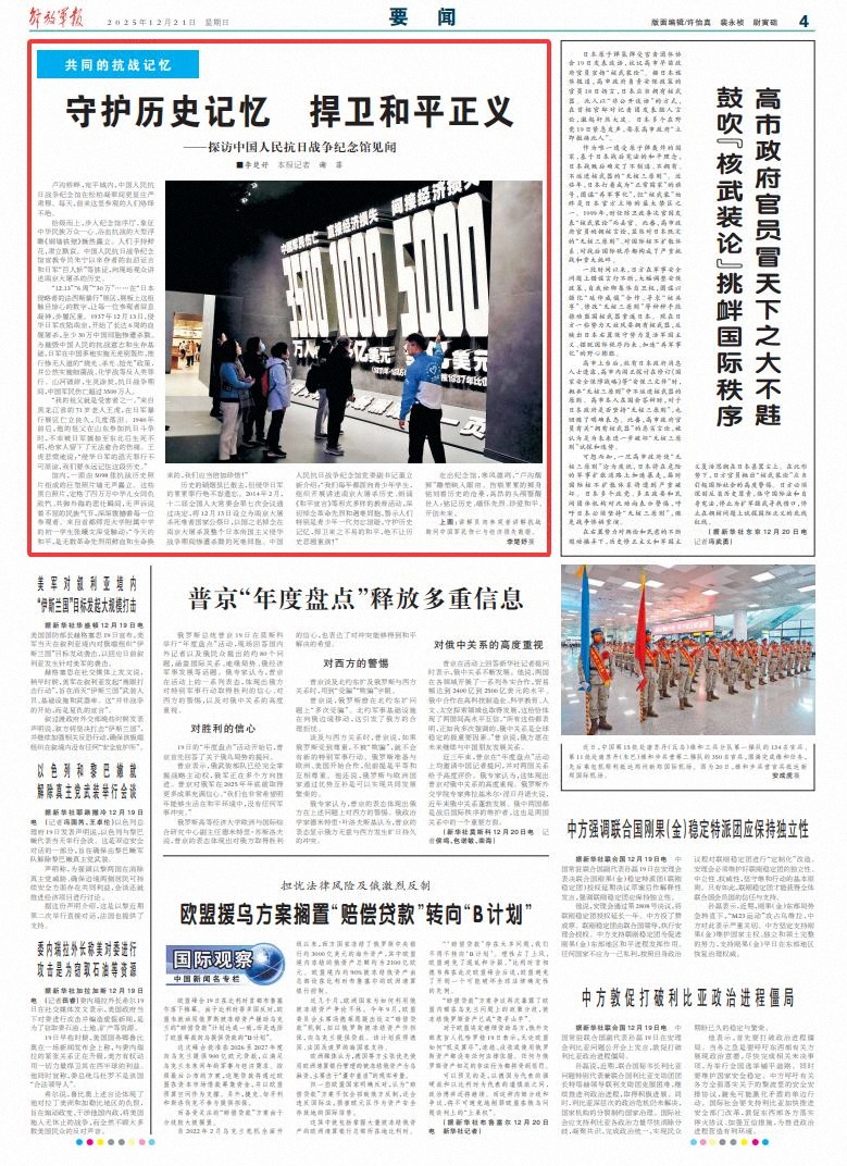 历史的硝烟虽已散去,但侵华日军的累累罪行绝不容遗忘。2014年2月,十二届全国人大常委会第七次会议通过决定,将12月13日设立为南京大屠杀死难者国家公祭日,以国之名悼念在南京大屠杀及整个日本帝国主义侵华战争期间惨遭杀戮的死难同胞。中国人民抗日战争纪念馆党委副书记董立新介绍:“我们每年都面向青少年学生,组织开展讲述南京大屠杀历史、朗诵《和平宣言》等形式多样的教育活动,深切悼念革命先烈和遇难同胞,警示人们特别是青少年一代勿忘国耻,守护历史记忆,捍卫来之不易的和平,绝不让历史悲剧重演!”