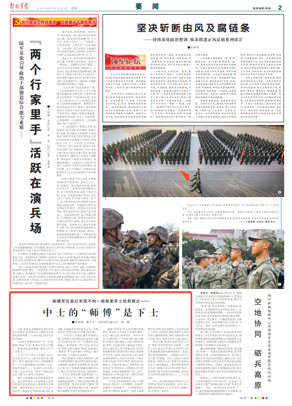 他们依据《军士暂行条例》《军士职业发展管理暂行规定》等法规科学制订实施细则,构建“机关统筹指导、基层单位主抓”的工作链路,明确各级职责分工,倾力为年轻军士成长成才创造条件。