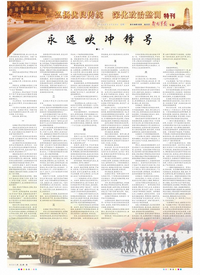 “寻根溯源整行装,初心永不忘;浴火新生的队伍,纯洁又荣光。向着一流再出发,奋进在路上;革命锻造更坚强,强军使命勇担当……”