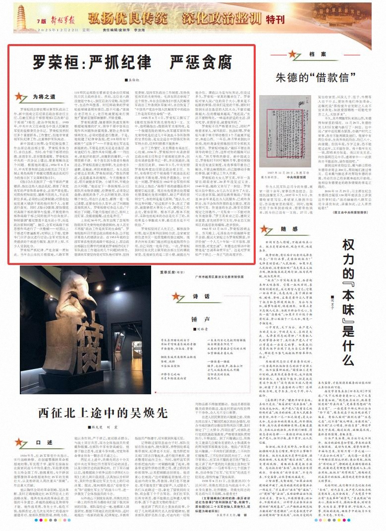 1963年12月16日,罗荣桓因病去世。当天晚上,毛泽东在中南海颐年堂开会前,提议大家起立为罗荣桓默哀,并评价他“一个人几十年如一日不容易,原则性强,对党忠诚”。朱德也在悼诗中称赞他是“忠诚革命贯平生”。这是对罗荣桓严于律己、一身正气的高度评价。