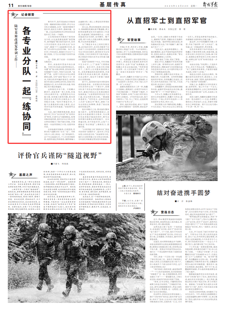这种情况并非个例。日常蹲点跟训中,该旅党委一班人发现,其他分队在演训中也一定程度存在专业能力强、协同能力弱等问题,根本原因还是各兵种分队合练机会少,协同配合生疏。“组织开展复补训,不能只注重提高单兵能力素质,还必须夯实战术协同基础。”该旅领导态度坚决。