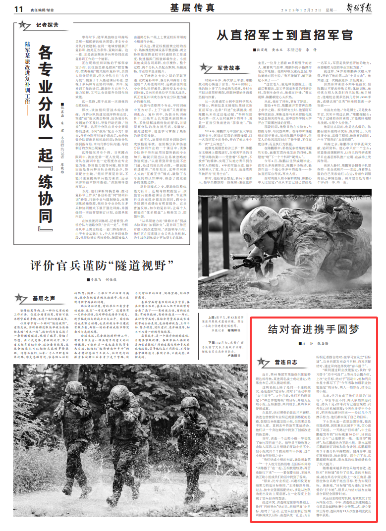 “原来,比专业相近、兴趣相投更有凝聚力的是目标相同。”王琦豁然开朗。过去,按专业强弱搭配结对,多是从连队角度出发的主观意愿,在一定程度上忽视了官兵自身的想法。