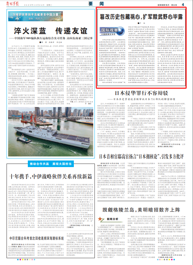 他们公然捏造“日本从未侵略”“战争是为了解放亚洲”等虚假叙事,将臭名昭著的731部队美化为“从事卫生研究的单位”,把强征“慰安妇”和劳工歪曲为“自愿行为”。他们大谈世界反法西斯力量对日本军国主义的打击,反复强调日本是“唯一遭受核武器打击的国家”,却对日本军国主义在他国犯下的滔天罪行及自身侵略扩张的本质避而不谈。更有甚者,竟将正视历史、承认罪责污蔑为“自虐史观”,把否认历史、美化侵略反包装成“正常国家”的表现。