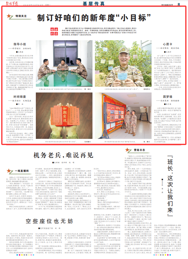 制订目标是激发官兵斗志、明确前进方向的常用方法,但在实践过程中,“确立目标大张旗鼓、落实行动虎头蛇尾”的情况时有发生。新的一年即将到来,各单位相继展开年终总结、新年度筹划等相关工作,如何帮助官兵制订合适的新年目标,让“目标牵引”切实发挥作用?本期“特别关注”介绍4个单位在今年进行的尝试,希望能对广大战友有所启发。