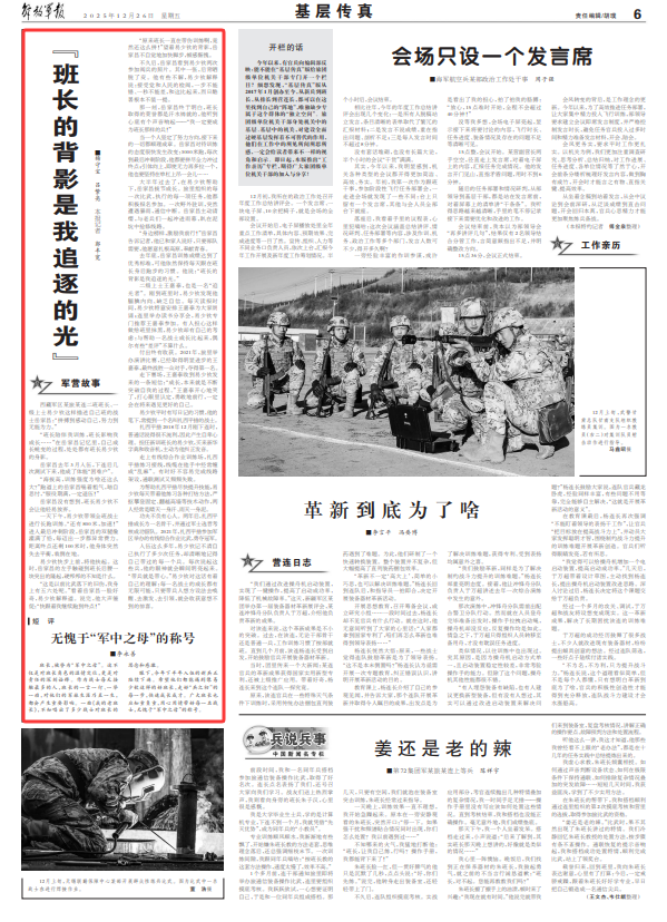 眼下,今年下半年入伍的新兵正陆续下连。希望他们都能遇到像易少钦这样的好班长,走好“兵之初”的每一步,快速成长成才。广大班长也应知重负重,用心用情带好每一名战士,无愧于“军中之母”的称号。