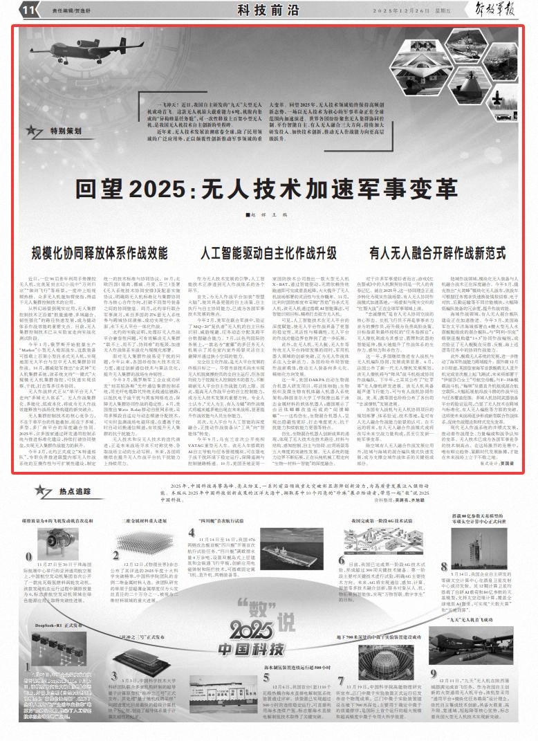 近年来,无人技术发展浪潮席卷全球,除了民用领域的广泛应用外,正以颠覆性创新推动军事领域的重大变革。回望2025年,无人技术领域始终保持高频创新态势,一场以无人技术为核心的军事革命正在全球范围内加速演进。世界各国纷纷聚焦无人集群协同控制、平台智能自主、有人无人融合三大方向,持续加大研发投入、加快技术创新,推动无人作战能力向更高层级跃升。