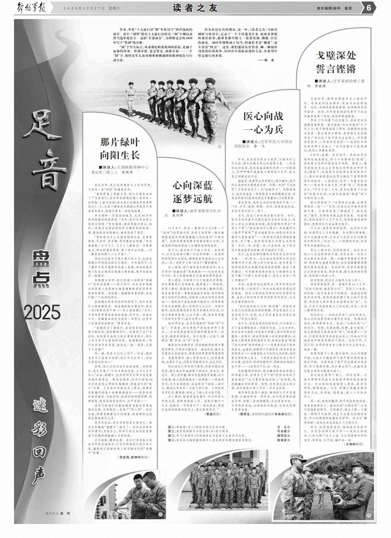 作为基层官兵的朋友,这一年,《读者之友》专版在倾听与对话中,记录了一个个浸透着汗水、绽放着梦想的成长故事,描摹着强军路上一张张坚韧、刚毅、自信的面孔。2025年即将画上句号,但成长不会“翻篇”,奋斗没有“终点”。这里,我们邀请几位作者,聊一聊稿件刊发的后续故事,在回首中汲取奋进的力量,在展望中坚定前行的步履。