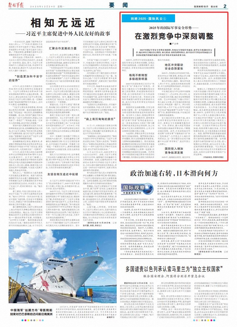 2025年,世界百年变局加速演进,国际军事安全形势深刻调整,呈现出多极化趋势加速、大国博弈激烈、地区冲突联动、军事竞争纵深发展的鲜明特征。