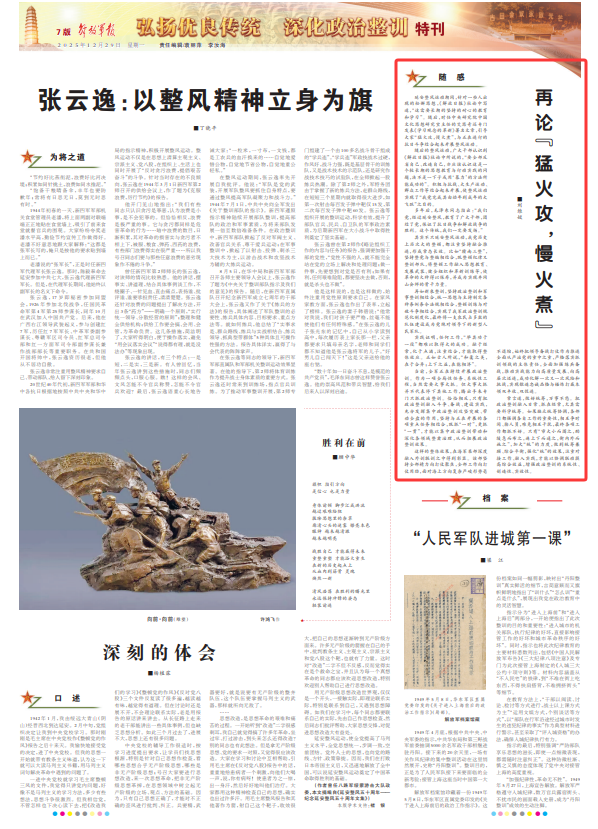 再如新泉整训,坚持政治整训和军事整训相结合,统一思想与主持制定各种条例条令法规相结合,整顿训练与对敌斗争相结合,实现了我军政治整训规范化制度化,最终将一支农民占多数的队伍建设成为党绝对领导下的新型人民军队。