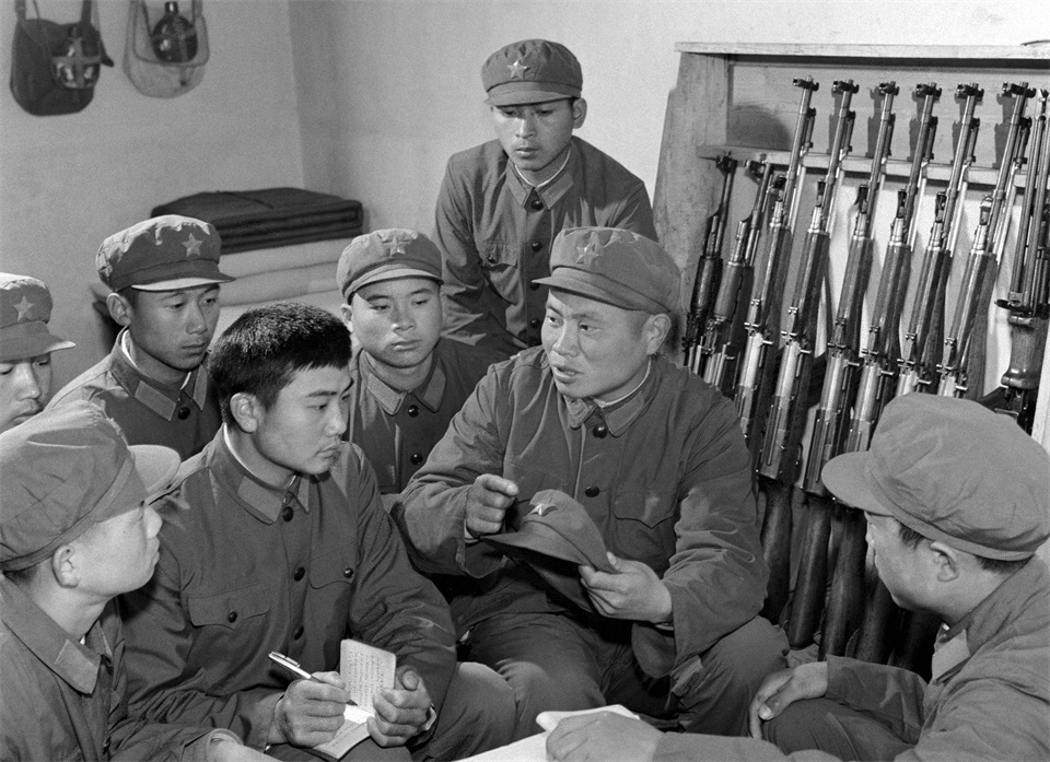 1977年,“刘老庄连”连长金海锋(右二)给战士讲述连队光荣历史。