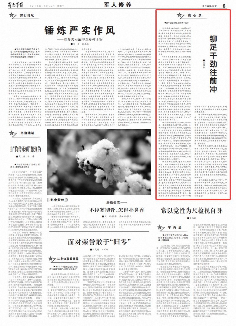 “风雨多经志弥坚,关山初度路犹长。”即将过去的2025年,广大官兵坚持用汗水浇灌梦想、以实干笃定前行,在强军征程上留下了坚实的奋斗足迹。然而,面对打好实现建军一百年奋斗目标攻坚战的艰巨任务,我们还有许多“硬骨头”要啃、“险滩”要闯。面对攻坚冲刺的时代大考,如果我们不铆足干劲往前冲、往前闯、往前赶,不仅难以超越强敌对手,反而会步入“一步慢、步步慢”的被动境地;如果我们新年度起步就松松垮垮,做不到踩足油门、快马加鞭,就难以赢得主动、抢占先机;如果我们不下定“不破楼兰终不还”的决心,拿不出“一张蓝图绘到底”的韧劲,就很难攻克建设难关、取得非凡业绩;如果我们不掸去松劲、怕苦、畏难等思想之尘,就难以正确认识和对待练兵备战的艰辛、转型建设的压力、现实矛盾的困扰,把内在的使命意识转化为外在的干劲闯劲。所以,我们要提振精神加油干,铆足干劲往前冲,抢抓机遇加快发展、汇聚力量攻坚克难,如此才能实现“十五五”开局之年的“开门红”。