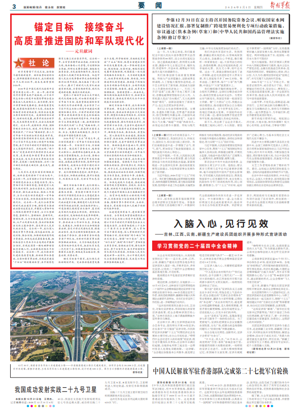 时序更替留下闪光足迹,接续奋斗谱写崭新篇章。满怀奋勇向前的信心,澎湃强国强军的动力,我们挥别很不平凡的2025年,迎来充满希望的2026年。