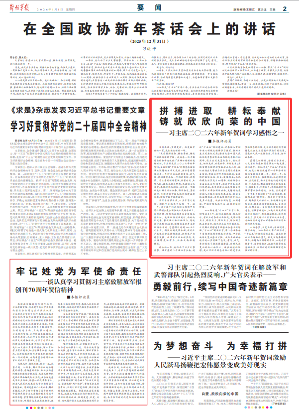 “大家拼搏进取、耕耘奉献,铸就了欣欣向荣的中国。我向每一位辛勤付出的奋斗者致敬!”在辞旧迎新的美好时刻,习主席发表二〇二六年新年贺词,全面回顾“十四五”时期党和国家事业取得的不平凡成就,满怀豪情赞颂过去一年神州大地的新变化、新气象,热切展望未来一年的新目标、新愿景。习主席的新年贺词,讴歌时代、点赞人民,激荡光荣与梦想,充满信心与力量,展现情怀与担当,必将进一步激励我们锚定目标任务,踔厉奋发、勇毅前行,不断开创中国式现代化建设新局面,续写中国奇迹新篇章。