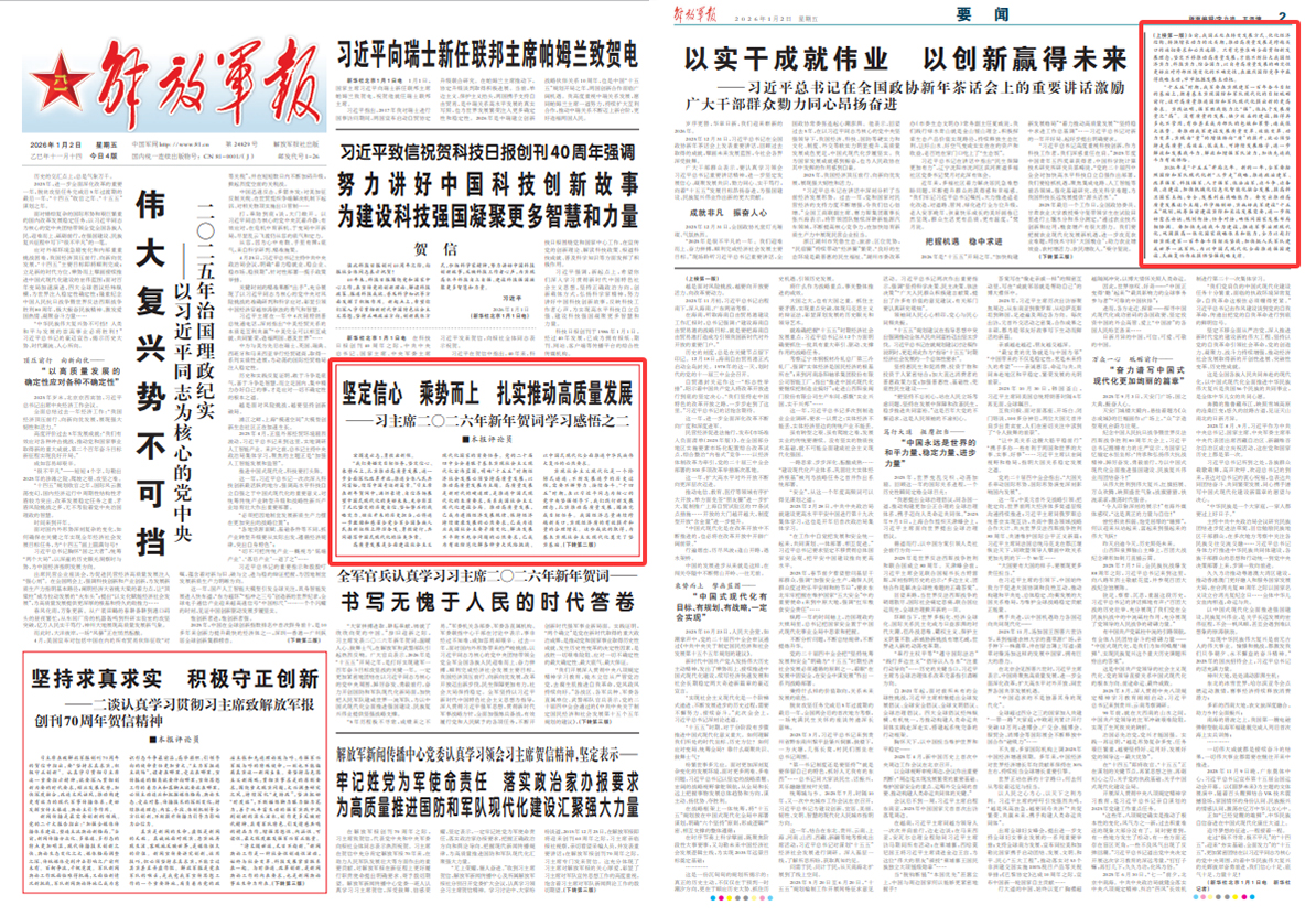 2026年是“十五五”开局之年。新的一年,全军要按照国防和军队现代化新“三步走”战略,推进政治建军、改革强军、科技强军、人才强军、依法治军,边斗争、边备战、边建设,加快机械化信息化智能化融合发展,提高捍卫国家主权、安全、发展利益战略能力。要突出推动高质量发展这个主题,科学编制好、实施好我军建设“十五五”规划,统筹当前建设实际和长远发展需要,进一步做好需求论证、规划衔接、任务对接,确保同国家发展布局相协调。要加快先进战斗力建设,推进军事治理现代化,巩固提高一体化国家战略体系和能力,全力以赴打好实现建军一百年奋斗目标攻坚战,加快把人民军队建成世界一流军队,为以中国式现代化全面推进强国建设、民族复兴伟业提供坚强战略支撑。
