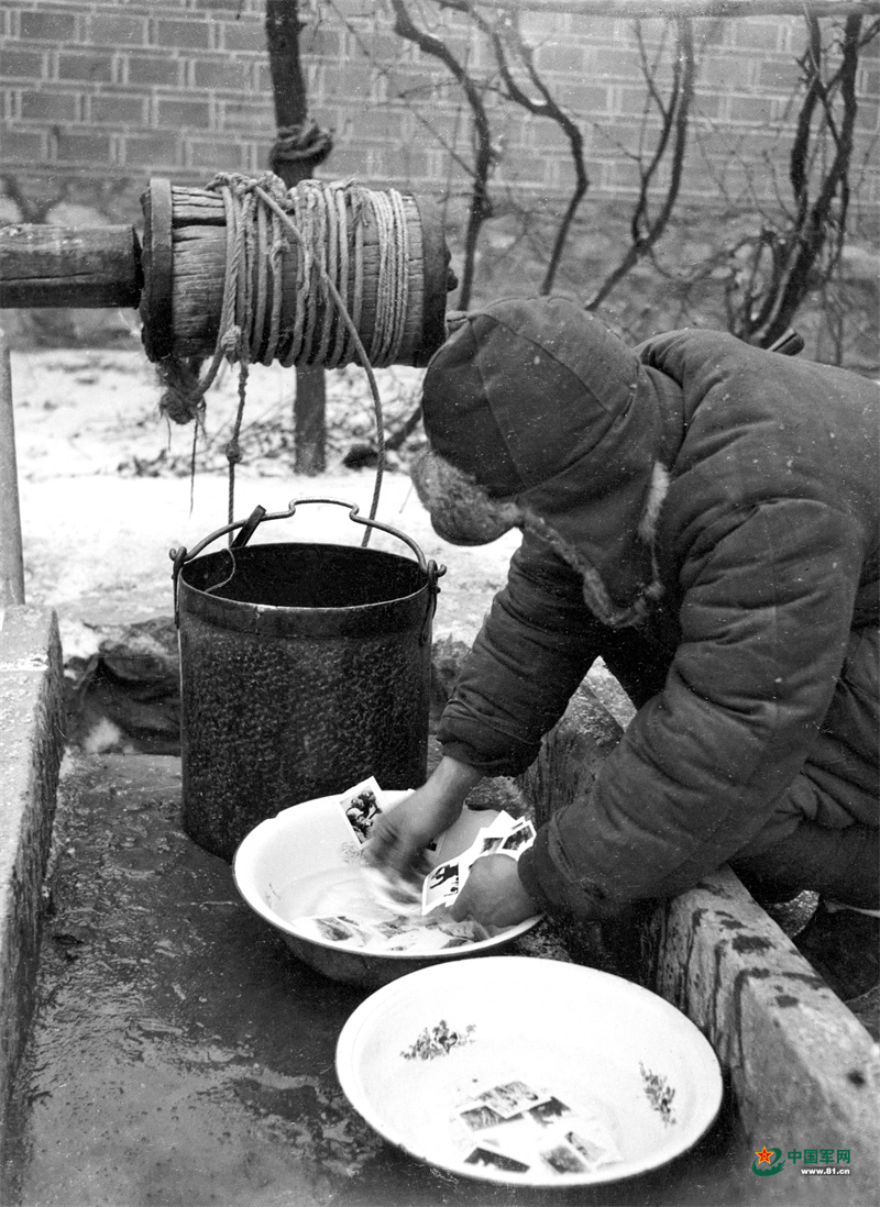 翻阅我军历史资料图片,看到两幅记录战争年代军事新闻工作者执行任务的老照片。其中一幅拍摄于解放战争攻克汤阴的战斗间隙,一名军事记者在战壕中席地而坐进行采访,旁边还有一名战士在观察敌情(图①)。另一幅中,华北某地冰天雪地,寒气刺骨,《晋察冀画报》的一名新闻工作者正蹲在一个水井旁,神情专注地洗印照片(图②)。从图片说明得知,该图亦拍自战斗前线。