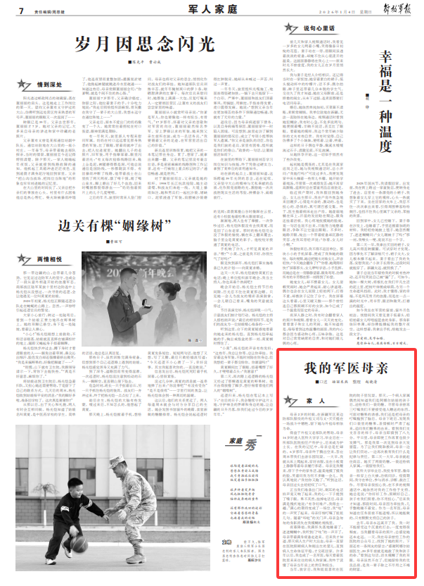 夜幕降临,我满怀失落地睡着了。迷迷糊糊中,我听到门“吱”的一声开了,母亲带着满身疲惫走进来。后来我才知道,那天病人生产时大出血,母亲一直留在医院照顾病人和刚出生的婴儿,直到病人生命体征平稳,才交班回家。许多年以后,我也成了一名军医,每天看着医院里来来往往的病人和家属,我终于读懂了母亲当年肩上的责任和担当。