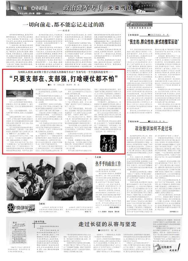 传统像一条蜿蜒的河流,绵延不绝,终成大海。守护传统,就是守护精神的火种。深化政治整训中,该部领导有一个共识:弘扬传统、永葆本色,党委一班人是关键。
