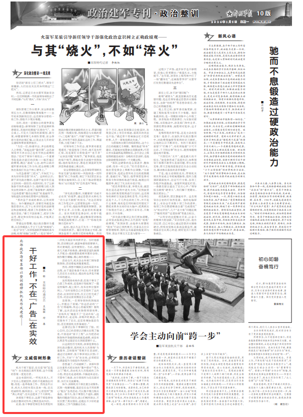 以这段经历为契机,该部党委结合深化政治整训,组织机关人员围绕“为谁服务、怎样服务”等展开反思剖析。通过讨论辨析,张干事深刻认识到:干好工作,不在“广告”在实效,必须把官兵满意度作为检验作风的标尺。