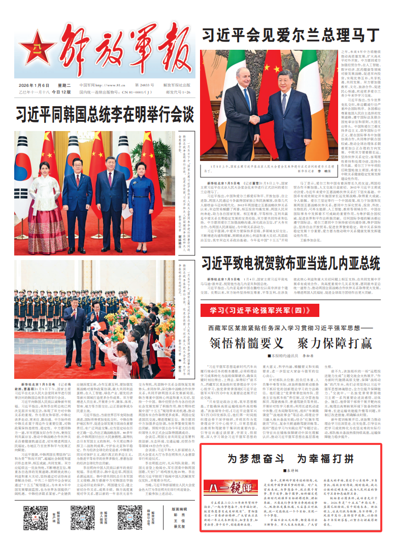 习主席在二〇二六年新年贺词中指出,“一起为梦想奋斗、为幸福打拼,把宏伟愿景变成美好现实”。贯彻落实这一重要讲话精神,广大官兵应在新的一年立足本职岗位,知重负重、知责担责、苦干实干,创造崭新业绩。