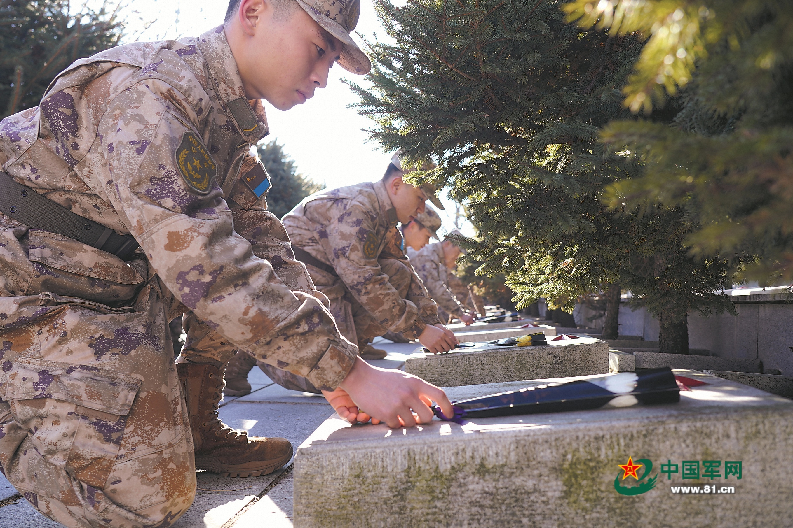 哀乐低回,松柏无声。一名名刚授衔的新兵走到烈士墓前,敬献朵朵鲜花。