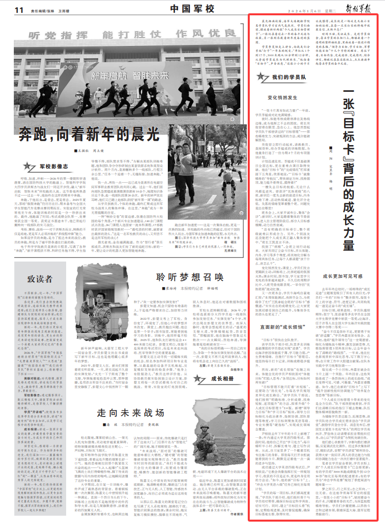 又一次班务会,学员牛海鸣自豪地汇报:“本周体能测试,我拼尽全力,为班级争了光!”王凯拿起全班的“目标卡”感慨道:“实实在在的成绩变化,让大家更加真切感受到自己的提升,为集体争光的劲头也更足了。”