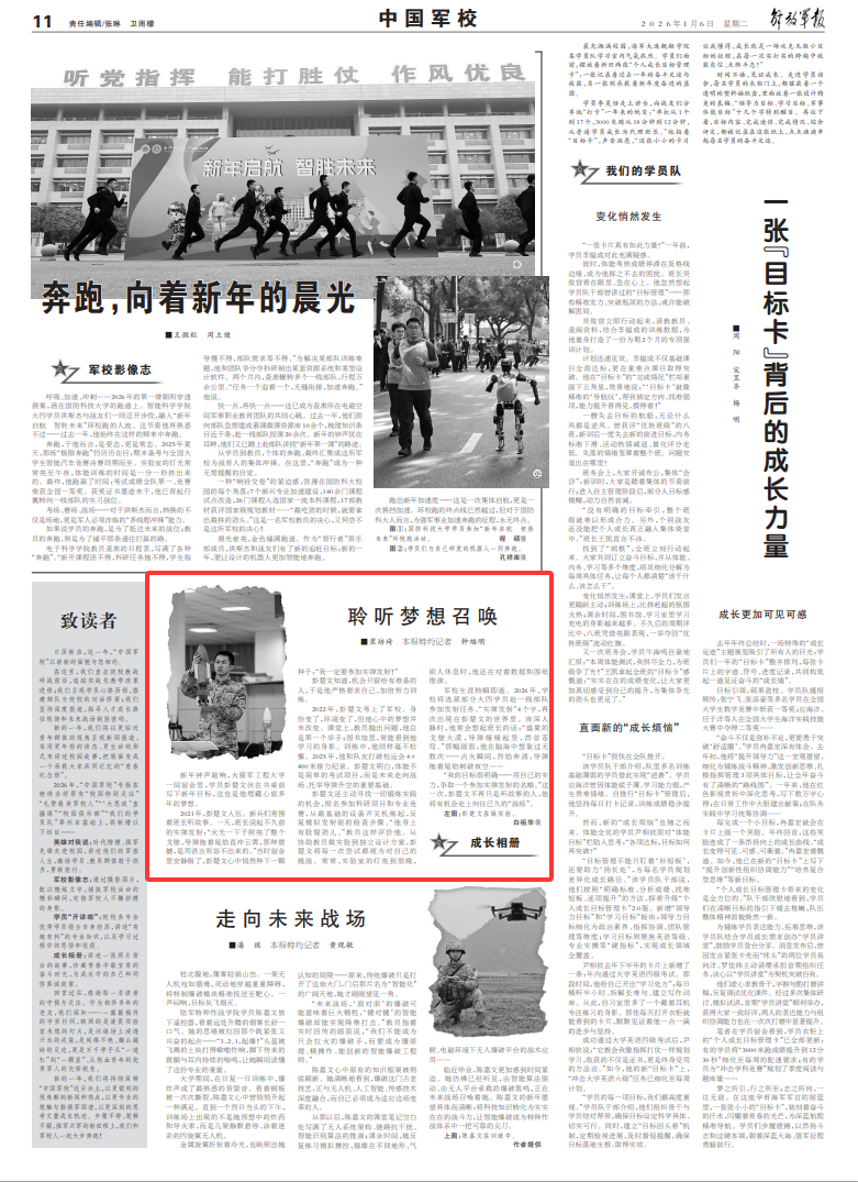 军校生涯转瞬即逝。2026年,学校将选派部分大四学员赴一线部队参加发射任务。“实弹发射”4个字,再次出现在彭楚文的世界里。夜深人静时,他常会想起班长的话:“盛夏的戈壁大漠,导弹缓缓起竖,昂首苍穹。”那幅画面,他在脑海中想象过无数次——点火瞬间,烈焰奔涌,导弹拖着尾焰刺破夜空……