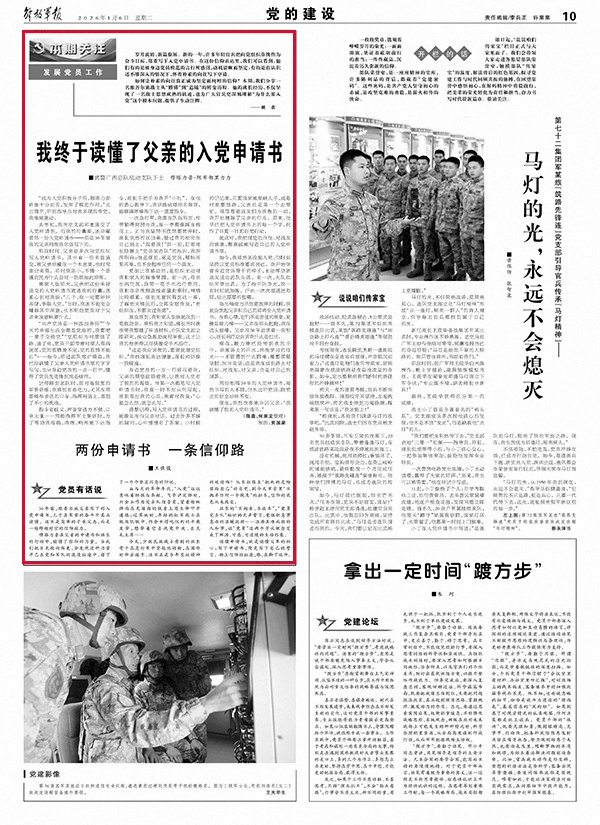 “共产党员是一种政治身份”“今天的幸福生活全都是党给的,我要把一辈子交给党”“党组织为村里修了路、通了电,党员干部带着村里人看病就医,党的恩情说不完,党的恩情不能忘”……如今,经过部队熔炉锻造,我已经读懂了父亲入党申请书里的字字句句,也从身边党员的一言一行中,懂得了党员先进性到底是啥样。