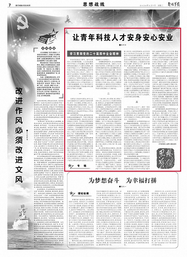 功以才成,业由才广。拥有一支创新型青年科技人才队伍,是国家创新活力之所在,也是科技发展希望之所在。必须强化系统观念,体系谋划、综合施策、整体推进,全力打造具有充分吸引力和包容性的人才环境,让青年才俊像泉水一样奔涌而出。