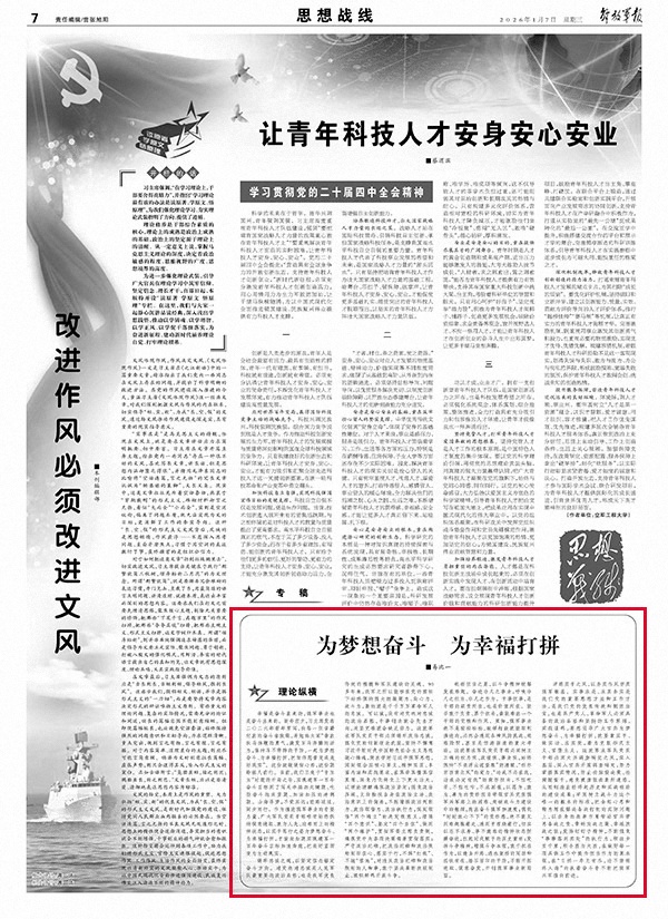 幸福是奋斗出来的,强军事业也是奋斗出来的。新年前夕,习主席发表二〇二六年新年贺词,向每一位辛勤付出的奋斗者致敬,并勉励大家“拿出跃马扬鞭的勇气,激发万马奔腾的活力,保持马不停蹄的干劲,一起为梦想奋斗、为幸福打拼,把宏伟愿景变成美好现实”。这份致敬暖彻心扉,这份期盼催人前行。当前,我们正处于“十五五”时期的开局之年,实现建军一百年奋斗目标到了闯关夺隘的关键期、吃劲奋斗的攻坚期、加油加压的冲刺期。山海寻梦,不觉其远;前路迢迢,阔步而行。作为推进强军事业的中坚力量,广大军队党员干部唯有始终保持锐意进取、敢为人先、迎难而上的精神状态,以实干笃行之姿为梦想奋斗、为幸福打拼,才能向如期实现建军一百年奋斗目标加速奔跑,把美好蓝图变为生动现实。