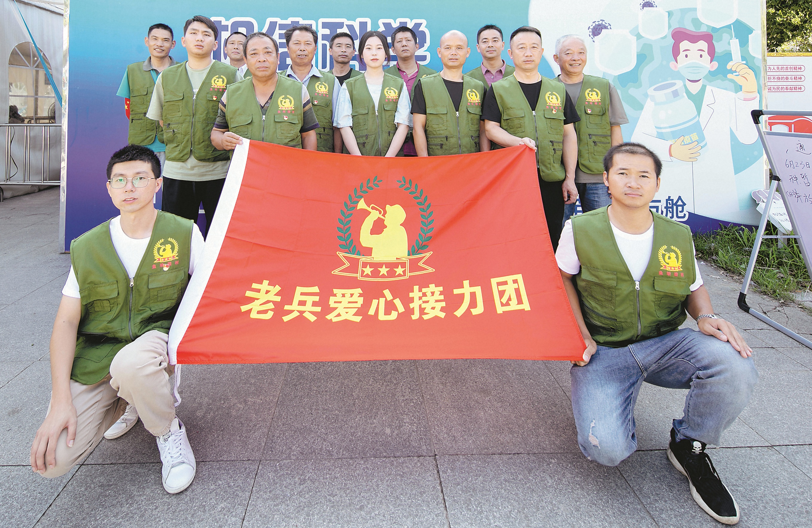 郑菘芳(中)参加“老兵爱心接力团”志愿服务活动时的合影。受访者供图