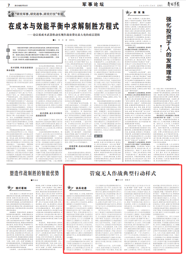 随着大数据、无人智能、物联网等高新技术在武器装备领域的深度物化,大量无人作战系统投入实战,推动战争形态和制胜理念加速演变。在未来战场上,高效运用无人作战系统,就要全面把握无人作战典型行动样式。