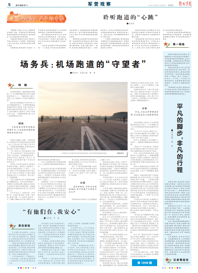 平凡的脚步,走出非凡的行程。当战鹰划破长空,人们仰望的是战鹰的雄姿,而我会想起那些跑道上的身影。他们用寂寞对抗风险,用重复打磨本领,让每一次起降都底气十足。强军事业从不是孤胆英雄的传奇,而是无数平凡岗位的托举。场务兵的平凡,恰是强军路上最坚实的注脚。